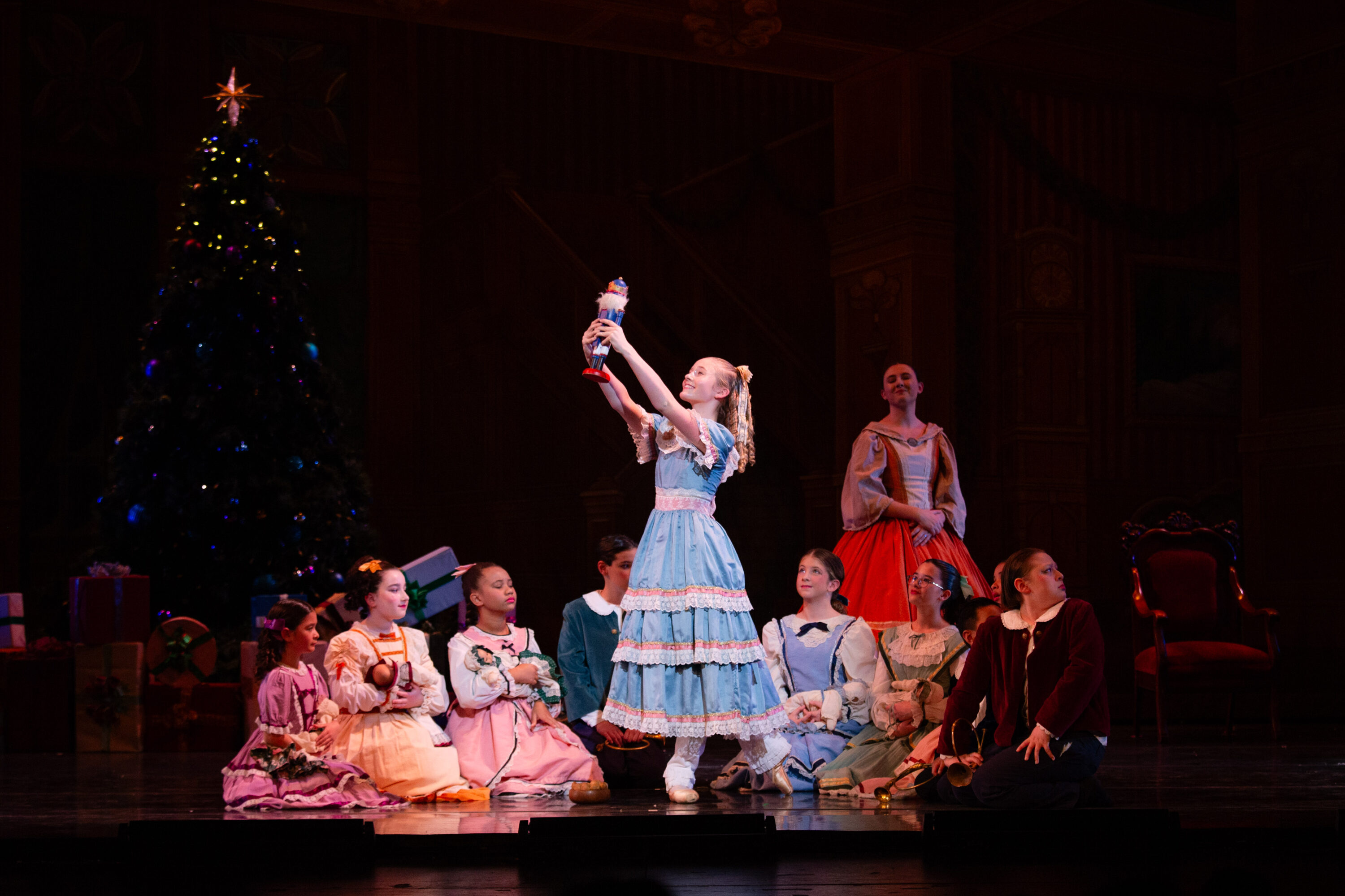 In anticipation of the upcoming holiday celebration, Clara dreams of a tall ethereal tree attended by magical fairies who deliver a mysterious gift. Meanwhile, Dr. Drosselmeyer, a marvelous magician and friend to all children, is in his workshop preparing two of his mechanical dolls Columbine and Harlequin, that will entertain the guests at the Silberhaus party. He will also bring a special gift to Clara: a wooden doll shaped like a brave soldier, which he believes to be his grandnephew, a prince who long ago was turned into a Nutcracker by an evil sorcerer. Dr. Drosselmeyer is determined to undo the spell and contrives the plan that will ultimately free the prince and change Clara’s life.