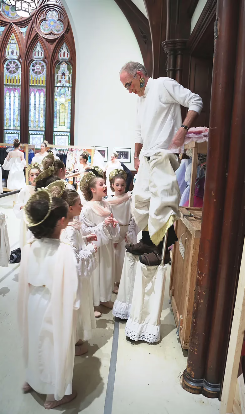 I joined JMBT in 1996 when my older daughter (Abby) first performed as a mouse. I started as a stage door dad but quickly and literally rose to the heights of playing Mother Ginger. The exhausted existing two Mother Ginger dads were looking for a sucker (volunteer) to take some of the load off them (we had dozens of shows back then). They asked if I had ever walked on stilts. No surprise, I hadn’t. Undeterred, they gave me a pair of stilts anyway and told me to take them home and learn. Thus began my 22-year “career” as Mother Ginger, continuing through the years of both daughters’ performances (Abby and Melissa) and beyond.