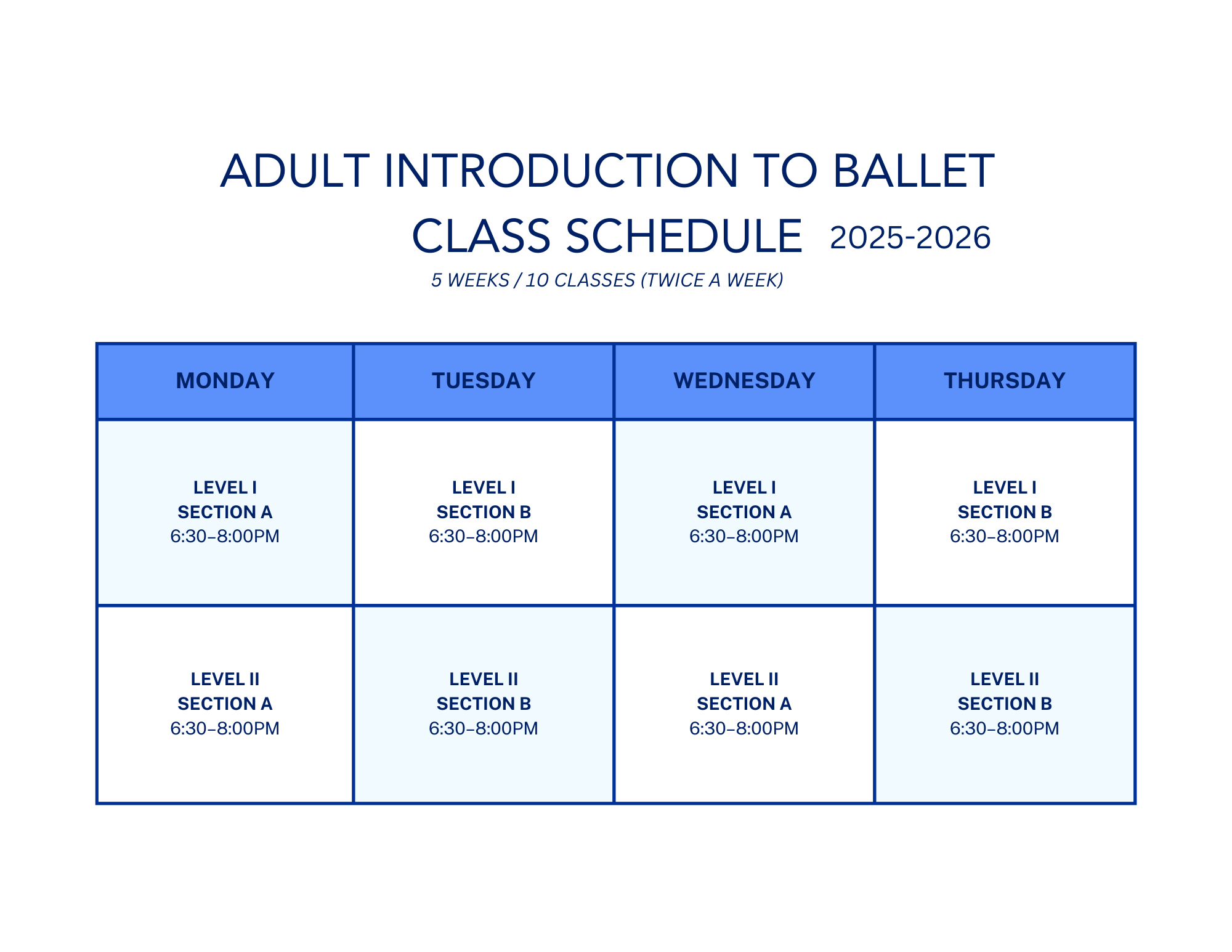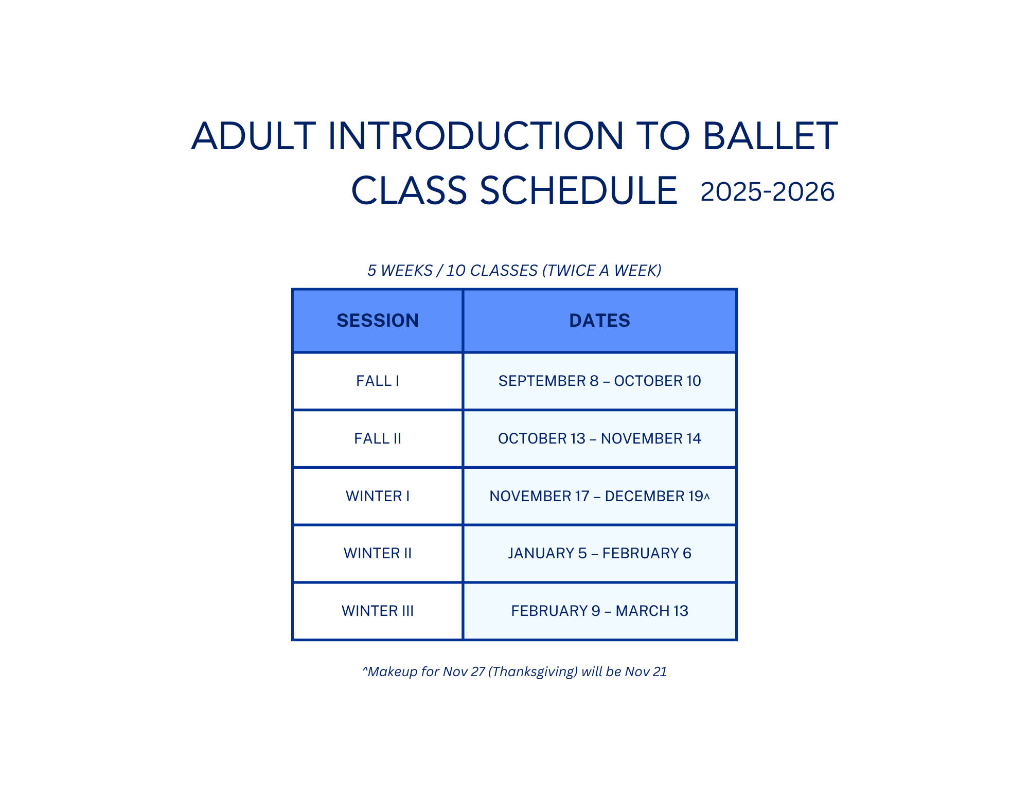 Adult Introduction to Ballet Enrollment Application 2025-265 weeks / 10 classes • Ages 18+400 Harvard Street, CambridgeClass Schedule & Calendar 2025-26Please enable JavaScript in your browser to complete this form.Please enable JavaScript in your browser to complete this form.Student Information – Step 1 of 5Name *FirstLastHave you enrolled in the Adult Introduction to Ballet program at JMBT before? *— Select Choice —YesNoDate of Birth *MM123456789101112DD12345678910111213141516171819202122232425262728293031YYYY20262025202420232022202120202019201820172016201520142013201220112010200920082007200620052004200320022001200019991998199719961995199419931992199119901989198819871986198519841983198219811980197919781977197619751974197319721971197019691968196719661965196419631962196119601959195819571956195519541953195219511950194919481947194619451944194319421941194019391938193719361935193419331932193119301929192819271926192519241923192219211920Gender / PronounsPrefer not to sayShe/HerHe/HimThey/ThemOptionalEmail *Mobile Phone *Home Address *Address Line 1Address Line 2CityAlabamaAlaskaArizonaArkansasCaliforniaColoradoConnecticutDelawareDistrict of ColumbiaFloridaGeorgiaHawaiiIdahoIllinoisIndianaIowaKansasKentuckyLouisianaMaineMarylandMassachusettsMichiganMinnesotaMississippiMissouriMontanaNebraskaNevadaNew HampshireNew JerseyNew MexicoNew YorkNorth CarolinaNorth DakotaOhioOklahomaOregonPennsylvaniaRhode IslandSouth CarolinaSouth DakotaTennesseeTexasUtahVermontVirginiaWashingtonWest VirginiaWisconsinWyomingStateZip CodeMedical & Additional InformationThe following information will only be used in the case of a medical emergency.Allergies *Injury History *Information we can provide to our faculty so they can better serve the needs of your student.Medications *Other medical conditions or history *Would you be interested in volunteering with José Mateo Ballet Theatre?YesNoIf you would like to earn free ballet classes, learn more about our Work Study Program!Emergency Contact InformationThis person will be contacted in case of an emergency situation.Emergency Contact Name *FirstLastRelationship to You *Mobile Phone *NextSave and Resume LaterDiversity and inclusion are at the core of José Mateo Ballet Theatre’s mission and commitment to the community. Gathering the information listed below allows us to improve the customer service that we give to all families. In addition, this information will further our diversity and inclusion efforts and assist in applying for grants and funding.This information will be kept anonymous and only be used to meet the needs of the families we serve.Ethnicity / Race *Prefer not to sayAsianBlack or African AmericanHispanic or LatinoNative American or Alaska NativeNative Hawaiian or Other Pacific IslanderWhiteOtherHousehold Income *— Select Choice —Prefer not to sayLess than $25,000$25,000 – $49,999$50,000 – $74,999$75,000 – $99,999$100,000 – $149,999$150,000 – $199,999$200,000 – $249,999$250,000 or moreWhat obstacles precent you from attending a José Mateo Ballet Theatre performance?Ticket costChildcareLocation of the theatreNot enough timeNot interestedOtherNone – I already attend!What is your neighborhood?How did you hear about José Mateo Ballet Theatre? *— Select Choice —ReferralSocial MediaSearch EngineWord of MouthAdvertisementEmail NewsletterEventWebsiteBlog PostOtherWho referred you? *PreviousNextSave and Resume LaterEnrollment AgreementI,Student Name *Your Namein José Mateo Ballet Theatre’s 2025/26 Adult Introduction to Ballet Program.I understand that payment is due in full at the time of enrollment.I understand that, should I, for whatever reason, be unable to participate, withdraw from the program, be dismissed with cause, or be absent from the program, payments will not be refunded. Makeup classes are not given unless the student has a valid doctor’s notice for extended absence.I understand that upon enrollment into the program that mixing and matching different classes/levels, and/or switching classes/levels is prohibited.I am aware that ballet training and the exercises associated with it can place stresses on the body and can risk physical injury. On behalf of the above named student and myself, I assume this risk and agree that José Mateo Ballet Theatre will not be liable in any way for injuries sustained during participation in the program or related activities.I grant José Mateo Ballet Theatre the right to make and use photographic and audiovisual documentation of me to be used for philanthropic, promotional, and other mission related purposes. (In no case will your identity be disclosed without written consent.)I understand that the primary method of communication from José Mateo Ballet Theatre is email through Constant Contact or Gmail in order to send announcements and other pertinent studio information.If there are any dates you will be absent or late, please list them here. *If there are any conditions that will prevent your full participation in the program, please describe them here: *Signature * Clear SignatureSignatureToday's Date *PreviousNextSave and Resume LaterRe-enrollment in each class is recommended if the student feels that they are not ready to progress to the next level. However, students are encouraged to only enroll for a maximum of 3 sessions of each level before it is recommended they move up.Level Selection *Level ILevel IILevel I Class Time *Monday & Wednesday | 6:30-8:00PMTuesday & Thursday | 6:30-8:00PMLevel II Class Time *Monday & Wednesday | 6:30-8:00PMTuesday & Thursday | 6:30-8:00PMLevel I is entirely full for Fall I !!Level II M/W is entirely for Fall II !!Level I is entirely full for Fall II !!Level II Session Dates *Fall I | September 8 – October 10Fall II | October 13 – November 14Winter I | November 17 – December 19^Winter II | January 5 – February 6Winter III | February 9 – March 13Level I Session Dates *Fall I | September 8 – October 10Fall II | October 13 – Nove