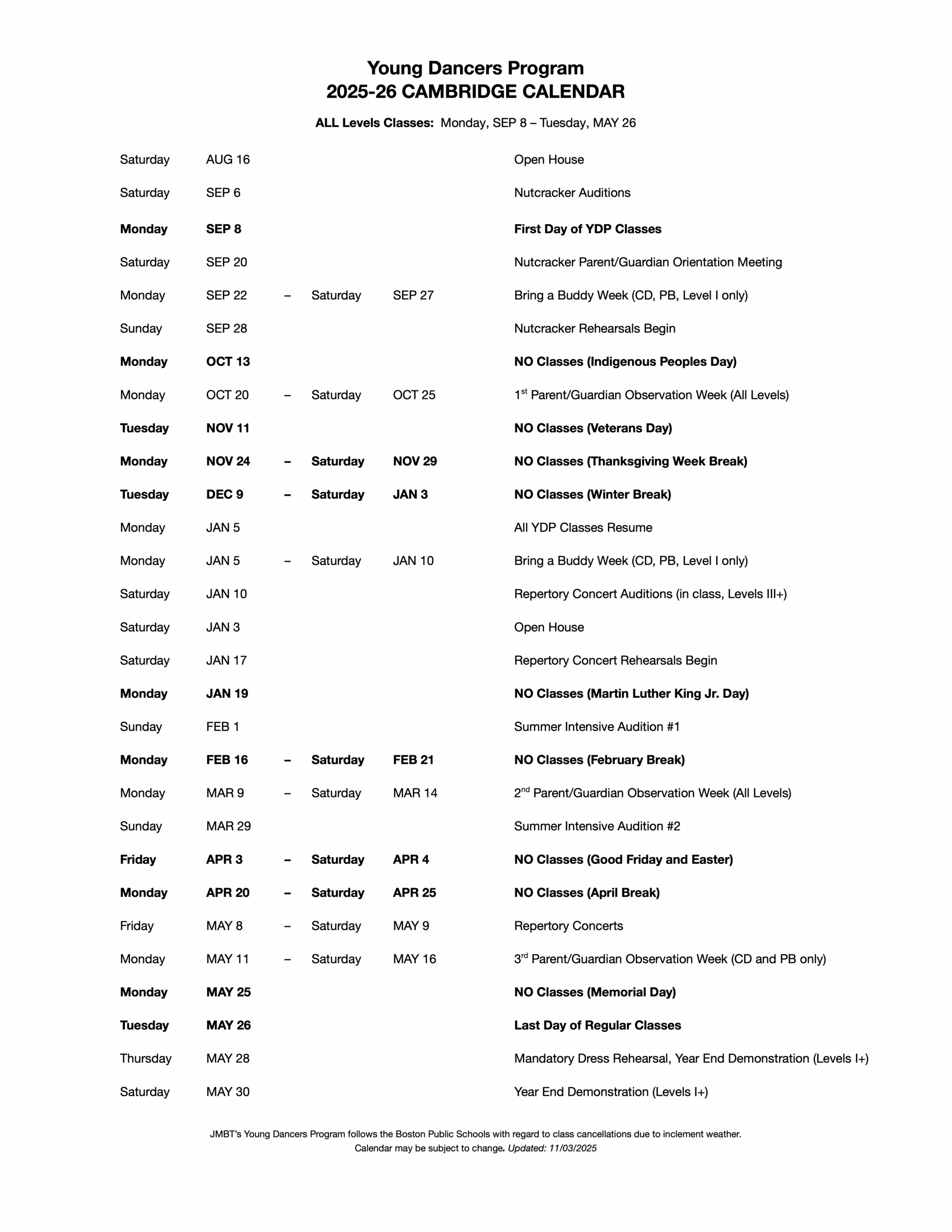 Calendar is subject to change. Please look out for emails and check the calendar on the YDP Cambridge/Dorchester page of JMBT’s website for updated information. JMBT follows the Boston Public Schools with regard to class cancellations due to inclement weather. Families will be notified via email if classes are canceled.