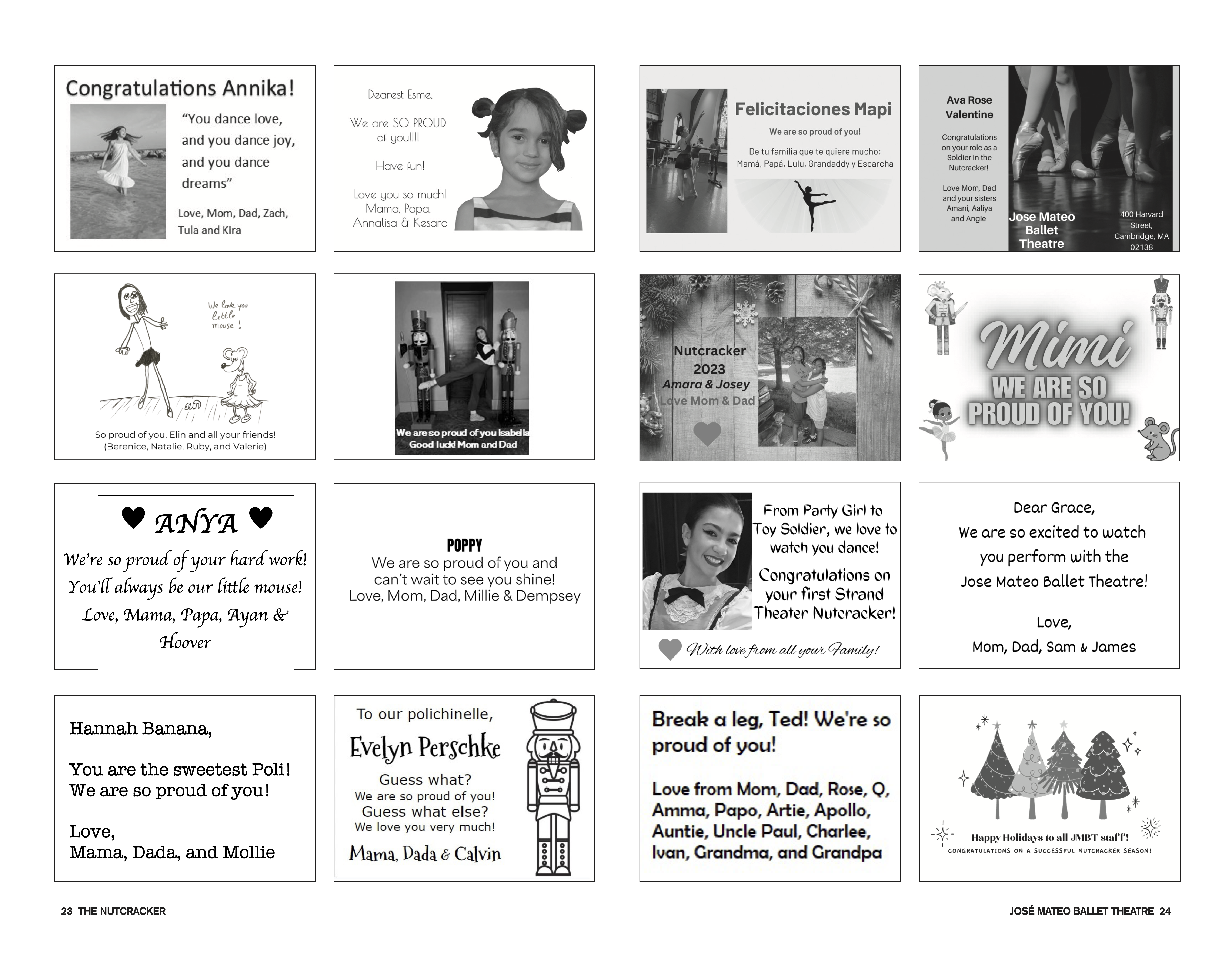 Celebrate your dancer’s hard work and achievements by purchasing a program book family shoutout! Write a personal message celebrating a dancer, teacher, staff member, or anyone part of this magical production. Small photos and graphics are also welcomed in our shoutout artwork. Your shoutout will then be printed in our program book and distributed to all Nutcracker audience members! For business or services, please refer to our Program Book Advertisements.