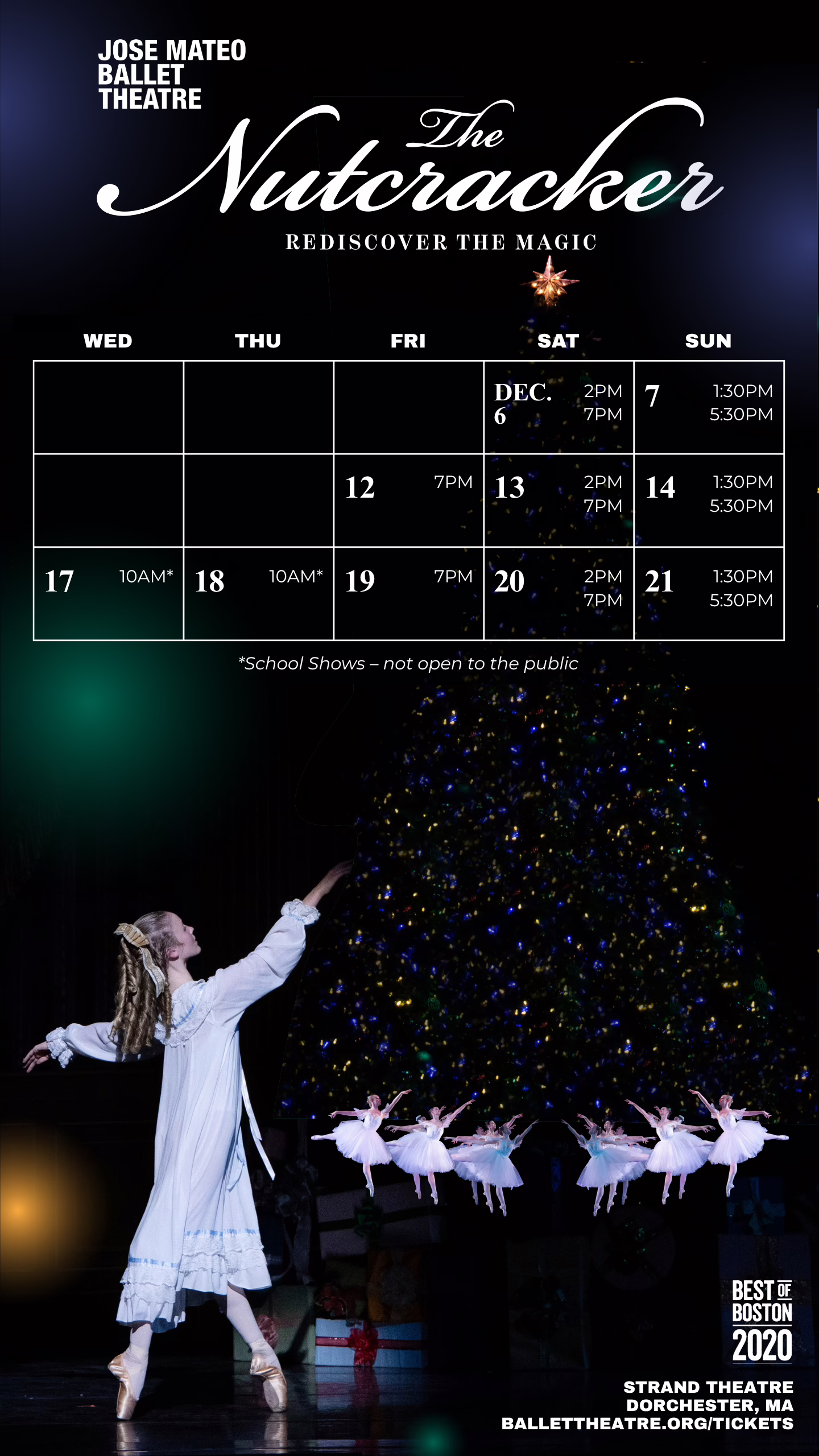 Choreographed by Founder and Artistic Director José Mateo and set to Tchaikovsky’s iconic score, JMBT’s The Nutcracker brings Clara’s dream world to life with festive sets, sumptuous costumes, and spectacular dancing. Over 100 children ages 6-18 join professional guest artists each year. JMBT’s The Nutcracker was recognized by Boston Magazine as “Best of Boston 2020 Best Family-Friendly Show.” Magical, thrilling, inspiring, and affordable, José Mateo’s The Nutcracker creates memories that will last a lifetime.