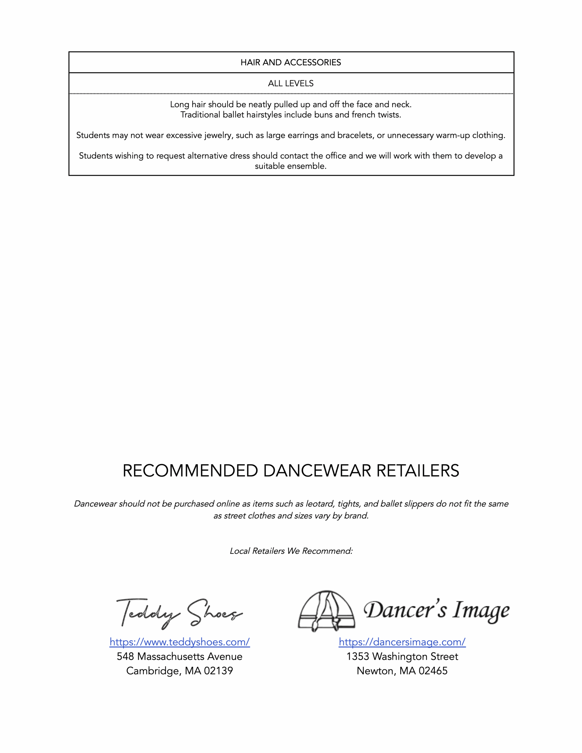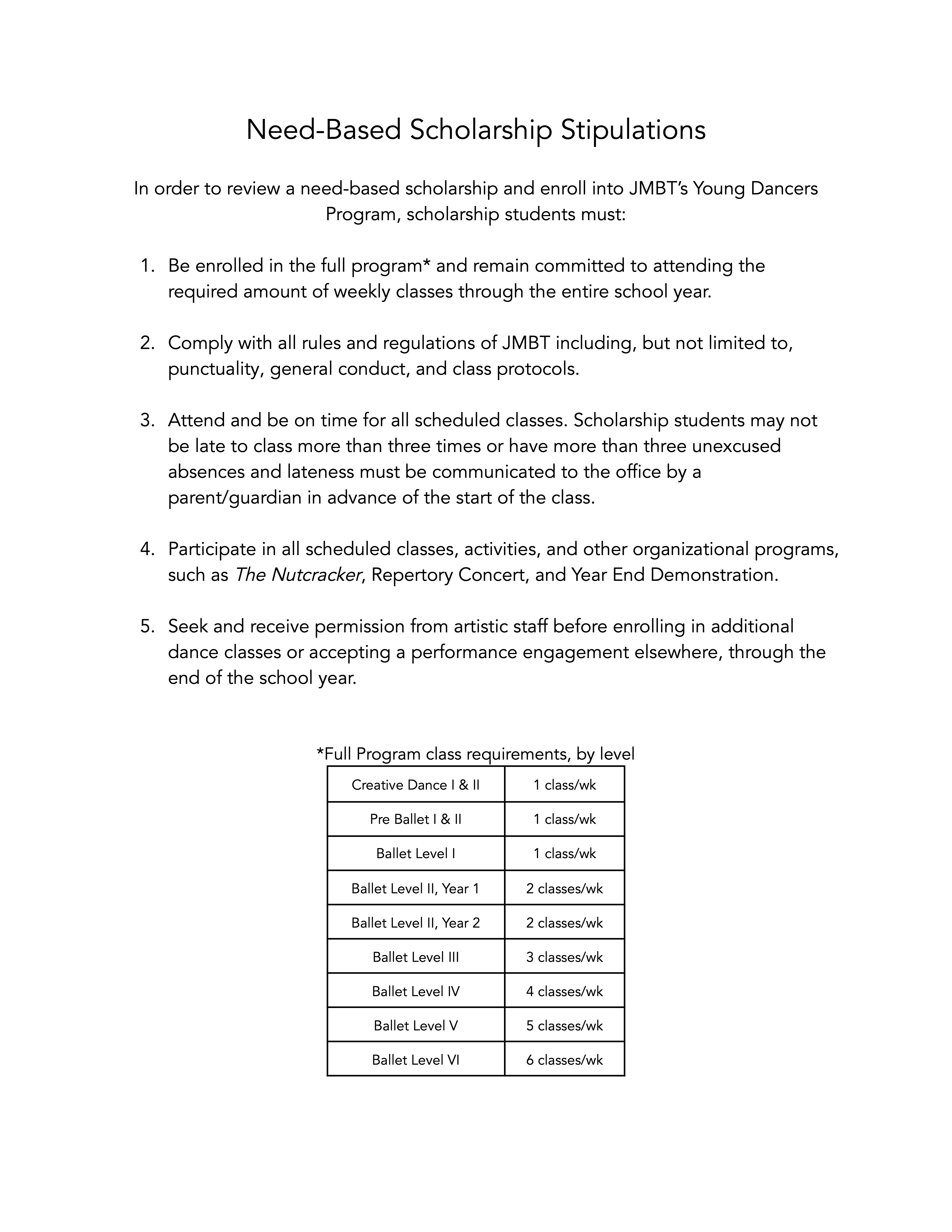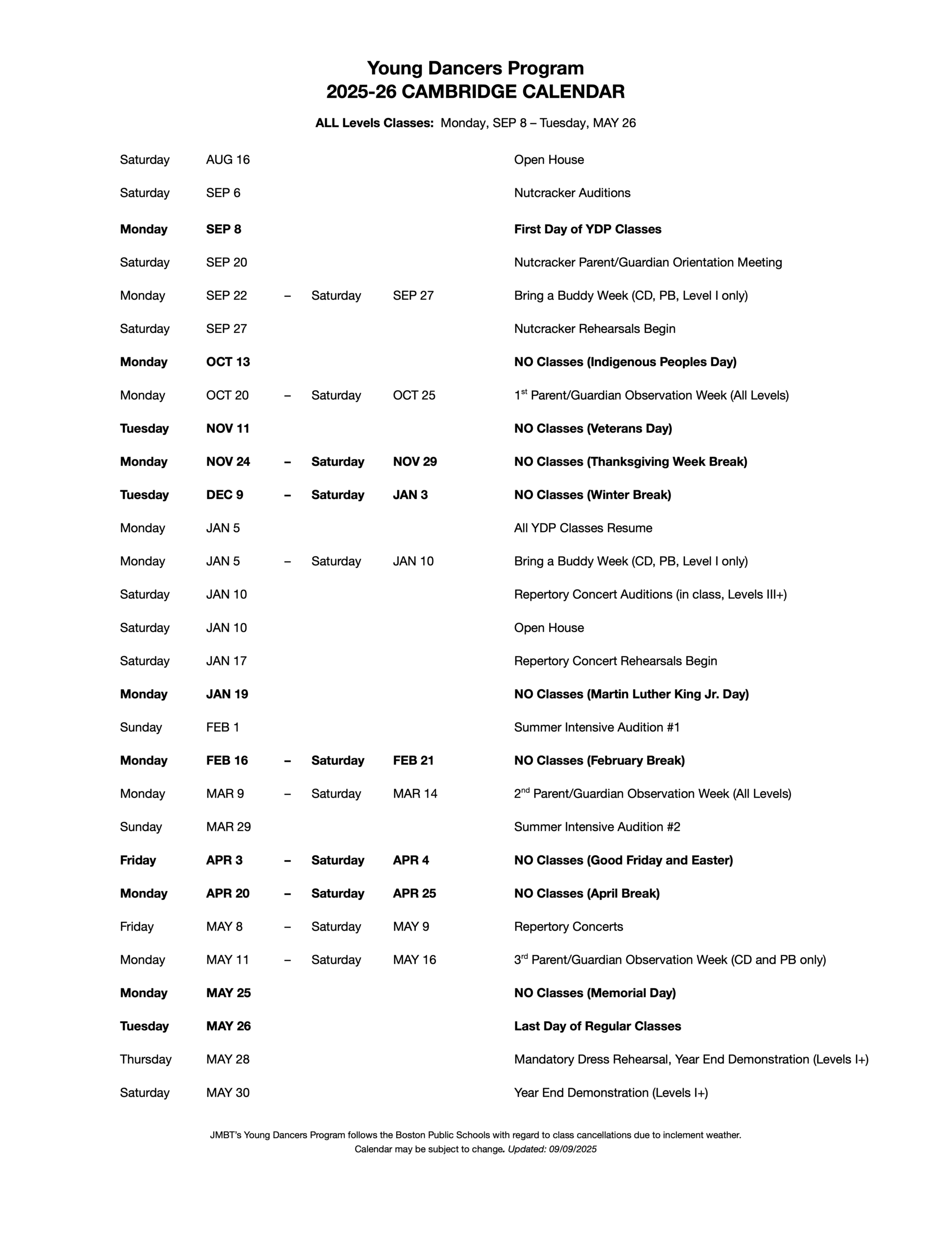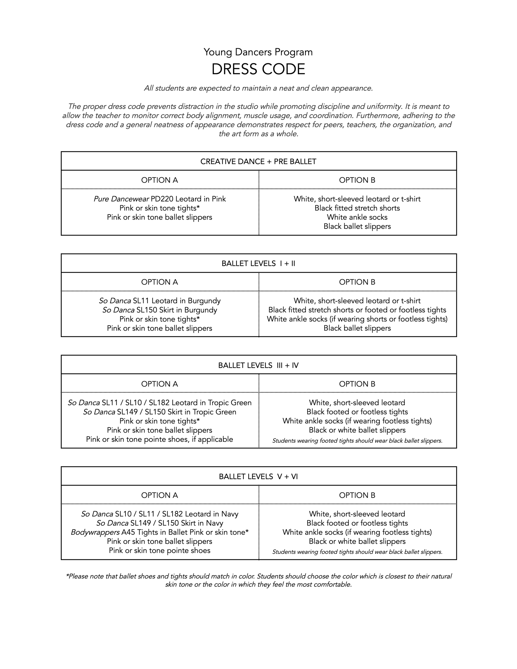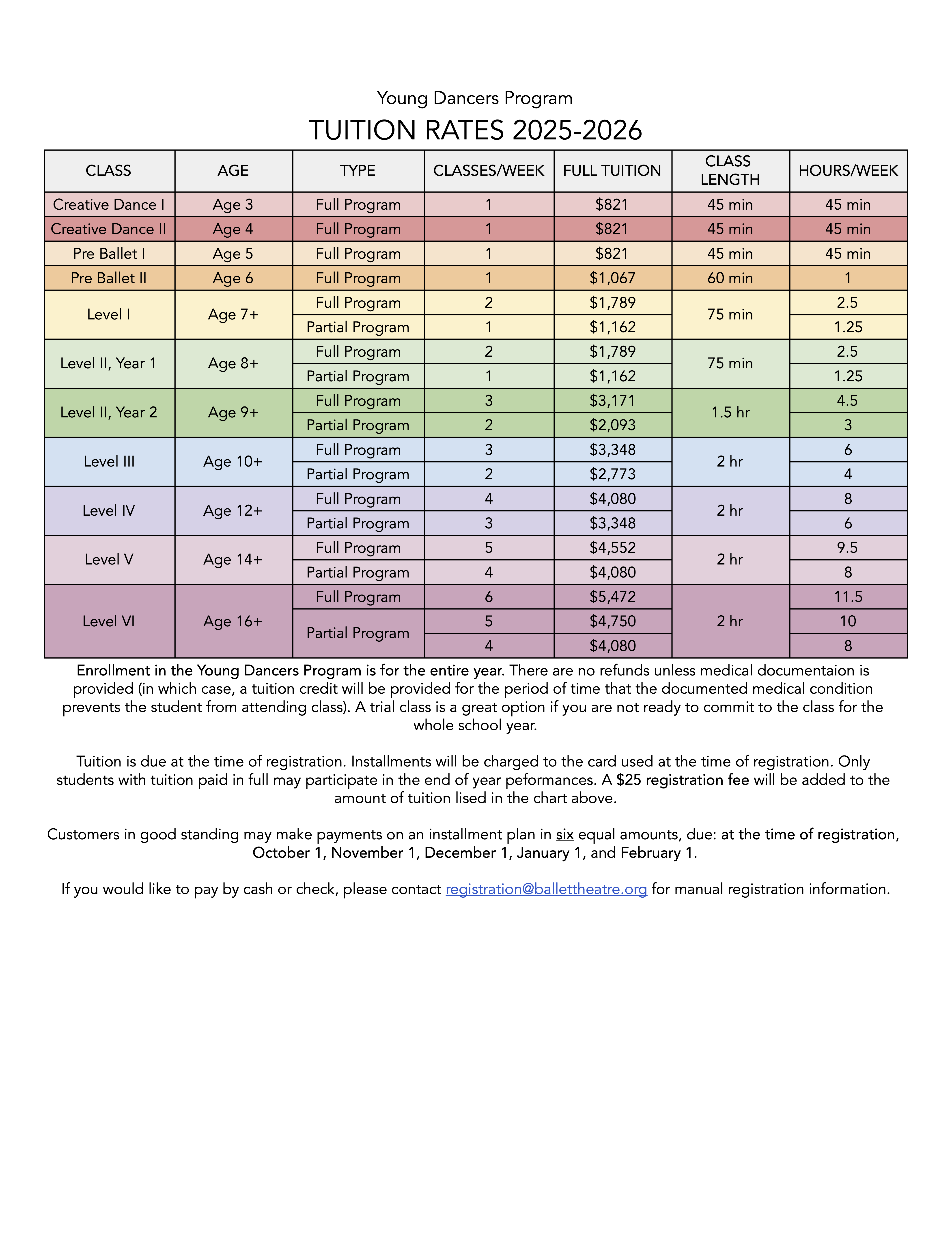 Students age 8 or older who were not previously enrolled in the 2025-26 Young Dancers Program will be asked to attend a placement class.